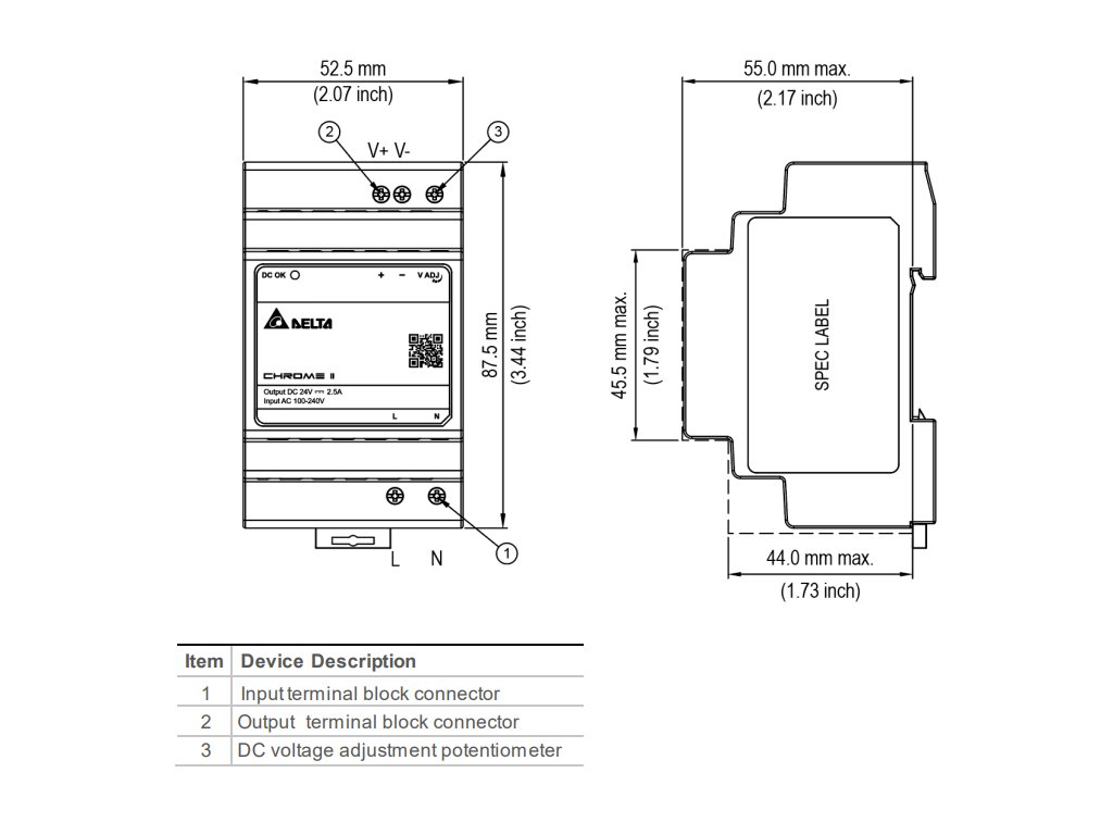 DRC-24V060W1RZ je nejnovější řada napájecích zdrojů Delta pro montáž na DIN lištu s výkonem 60W. Napájecí zdroj na DIN lištu vhodný pro montáž na montážní lišty TS-35/7,5 nebo TS-35/15.