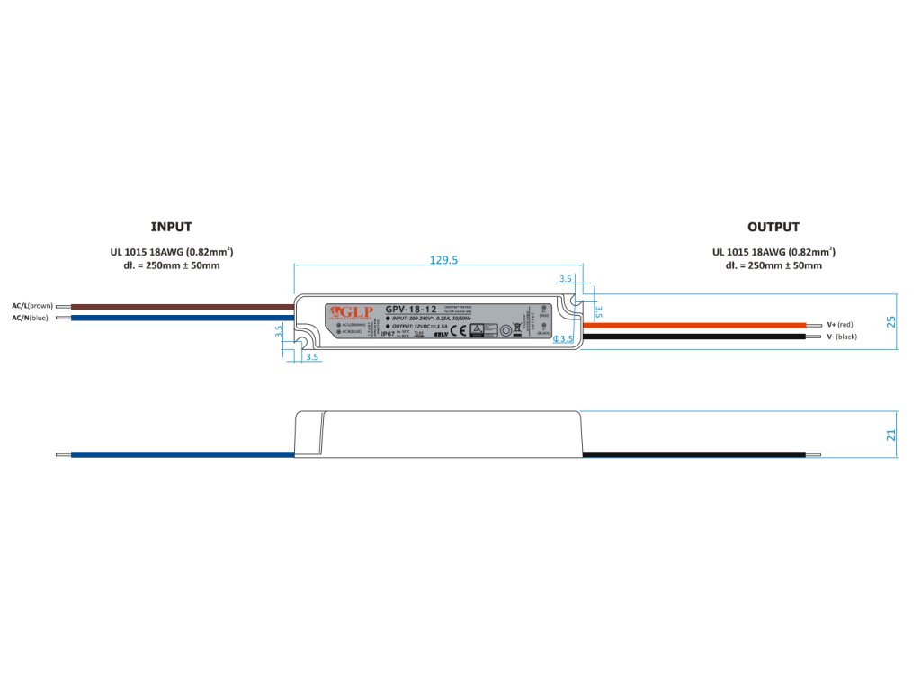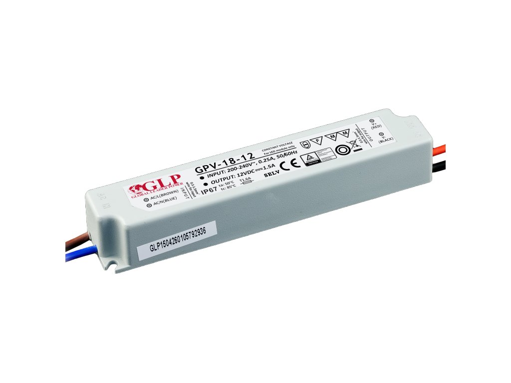 GPV18 W je AC/DC napájecí zdroj pro led pásky s konstantním výstupním napětím. Řada GPV-18 se vyrábí pro napětí12 V, 24 V, které jsou vhodné do nízkopříkonových aplikací. Nabízí široký rozsah vstupního AC napětí, ochrany proti zkratu, přetížení a přepětí a je v plastovém pouzdře s krytím IP67. Vhodný pro LED osvětlení, reklamní panely nebo další DC zařízení.