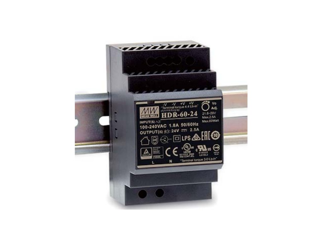 HDR-60 je ultratenký 60W napájecí zdroj na DIN lištu vhodný pro montáž na montážní lišty TS-35/7,5 nebo TS-35/15.