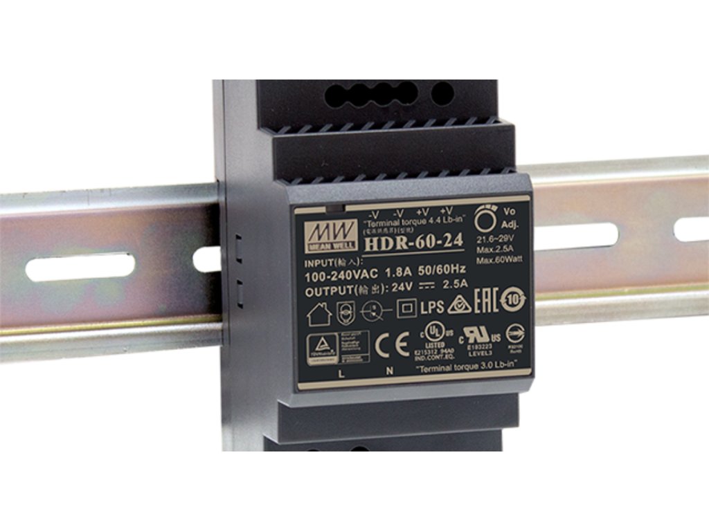 HDR-60 je ultratenký 60W napájecí zdroj na DIN lištu vhodný pro montáž na montážní lišty TS-35/7,5 nebo TS-35/15.