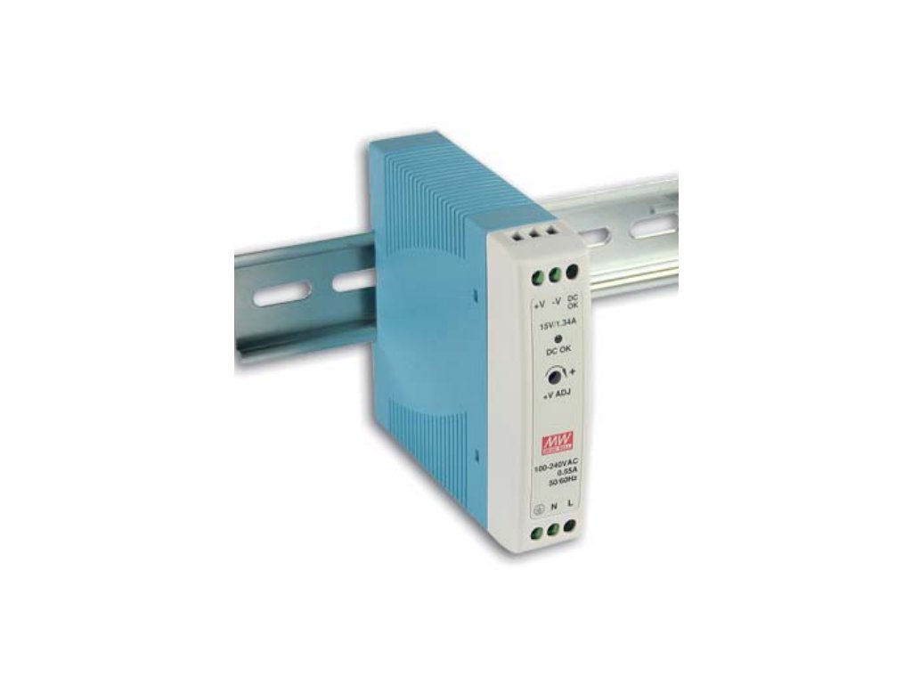 Plastový MDR-20-5 je jednofázový 20W napájecí zdroj na DIN lištu vhodný pro montáž na montážní lišty TS-35/7,5 nebo TS-35/15.