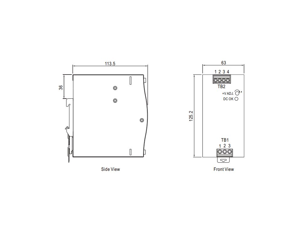 Úzký NDR-240 je jednofázový 240W napájecí zdroj na DIN lištu vhodný pro montáž na montážní lišty TS-35/7,5 nebo TS-35/15.