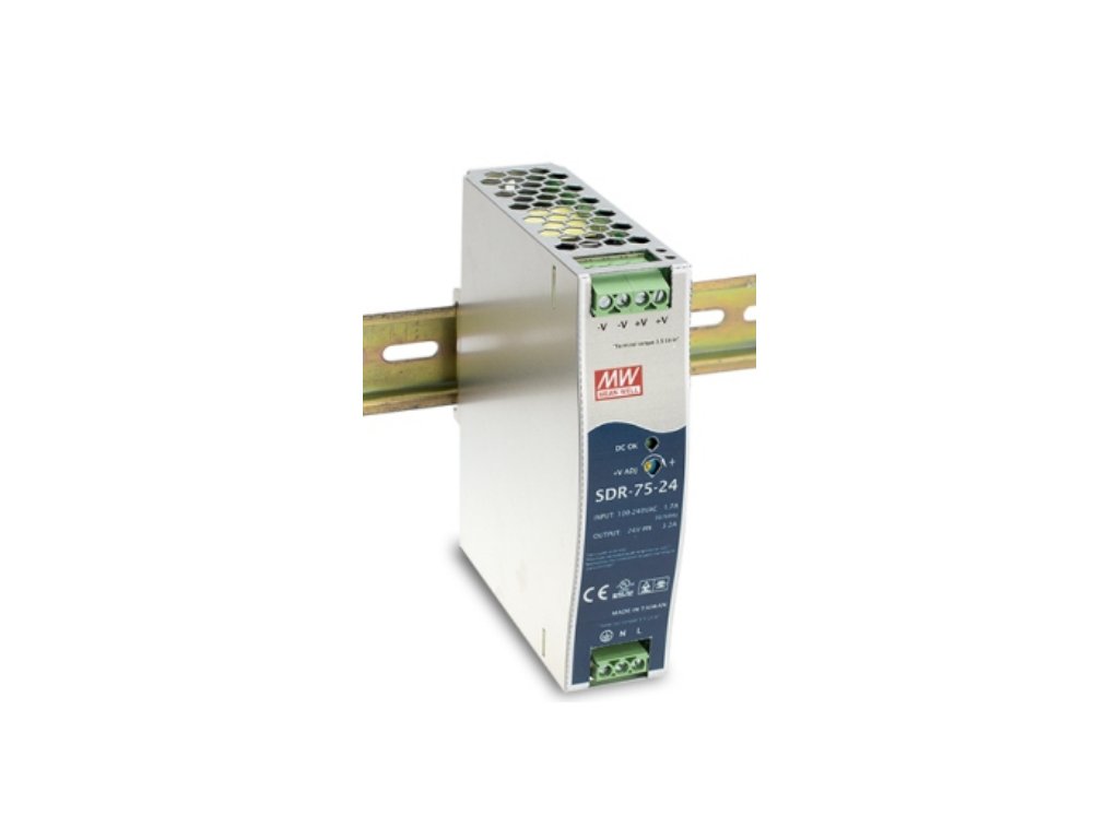 Zdroje SDR-75 využívají kovové pouzdro, které zlepšuje odvod tepla a zajišťuje vysokou mechanickou odolnost v průmyslovém prostředí. Díky účinnosti až 88,5 % může série spolehlivě pracovat při okolních teplotách od -20 °C do +70 °C s přirozeným prouděním vzduchu. Splňuje požadavky normy BS EN/EN61000-3-2, kterou Evropská unie stanovuje pro omezení harmonických proudů. Vestavěná aktivní korekce účiníku PFC. Na vstupní straně zdroj obsahuje svorky k připojení vstupního napájecího napětí. Na výstupní straně obsahuje dva kladné a dva záporné póly 24V DC.